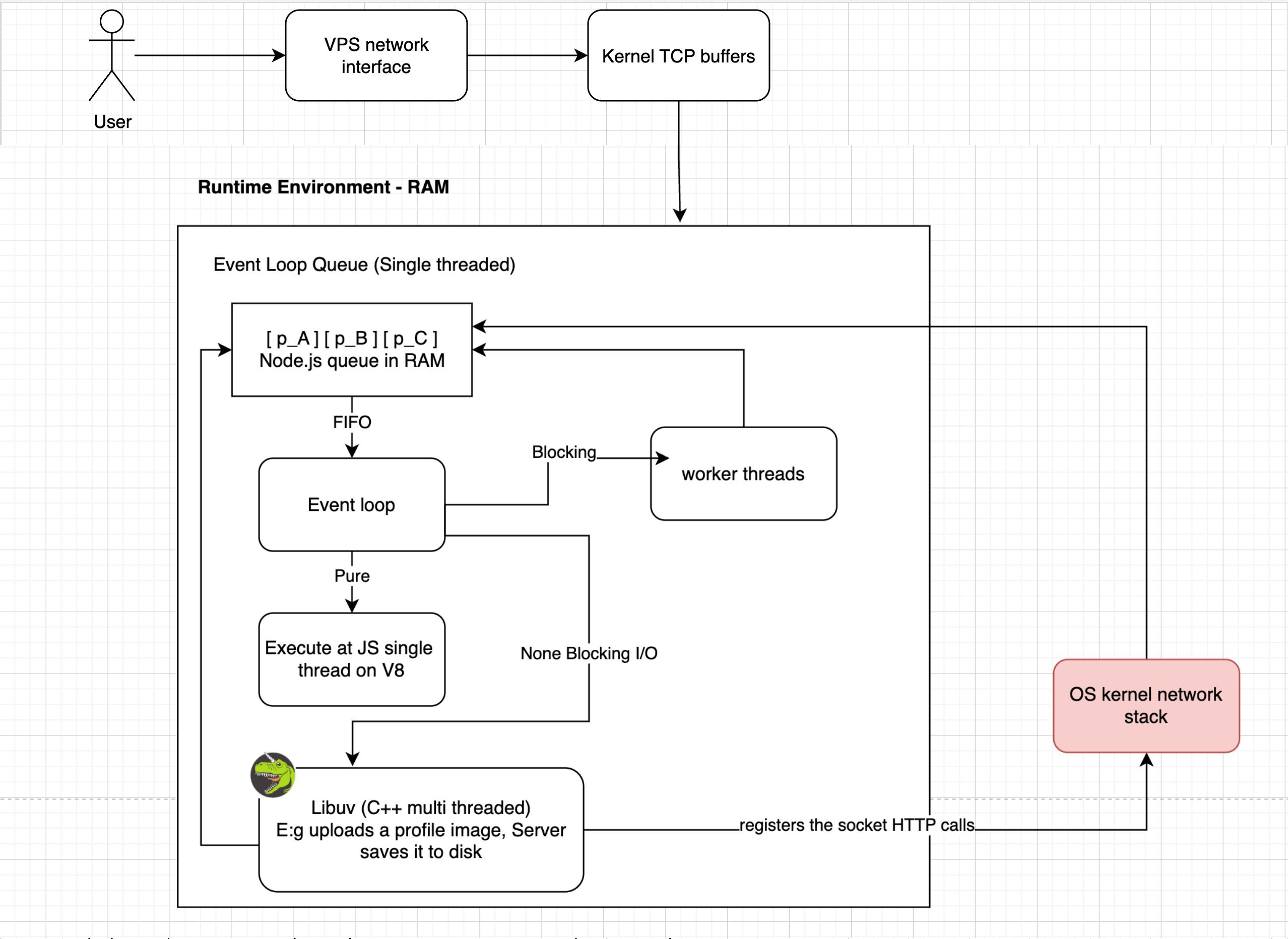 When a user visits a website, the request reaches the VPS (server) and is stored in the Kernel TCP buffers. Node.js is loaded into RAM, providing the runtime environment and V8 engine. The request reaches your JavaScript program. Node.js stores events in a queue, and the event loop picks one event at a time in FIFO order.